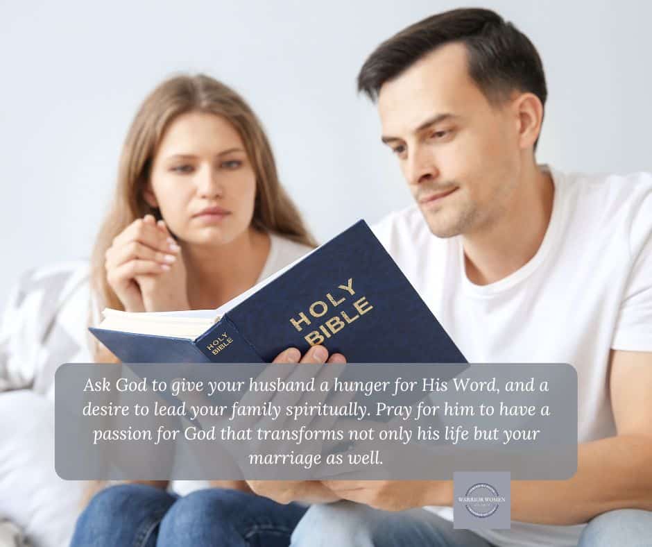 As you pray, ask God to give your husband a hunger for His Word, a desire to lead your family spiritually, and the strength to resist the temptations that pull him away from faith.